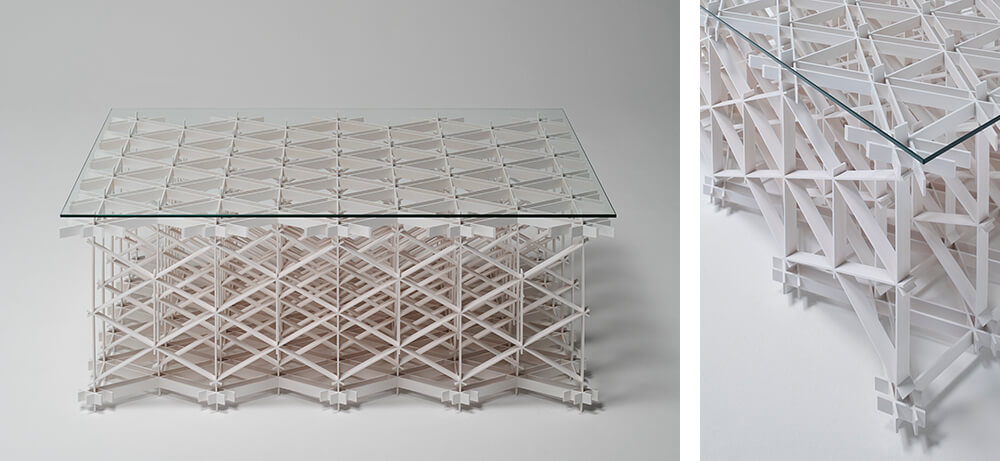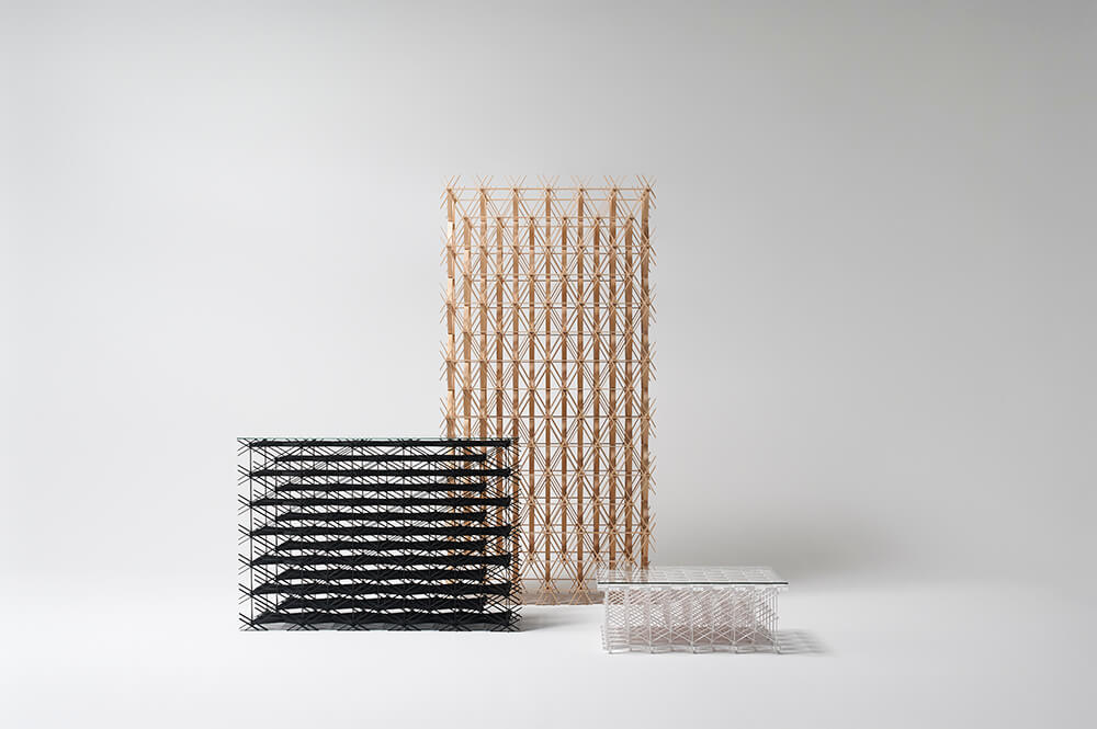 に着目し、小さな断面の部材のみで枠などを使わずに立体的に組み付け