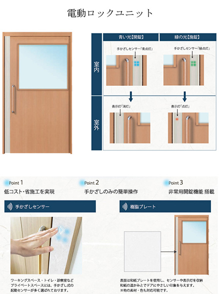 「電動ロックユニット」は、高齢者施設向け商品であるHAARTFULシリーズの新商品です。戸先に90㎜のユニットを設置し電源をつなぐだけで、非接触電気錠(手かざしセンサースイッチ)の設置が可能となるオプションを設定したドアユニットで、トイレ等の用途に適しています。また、低コストかつ省施工を実現しています。