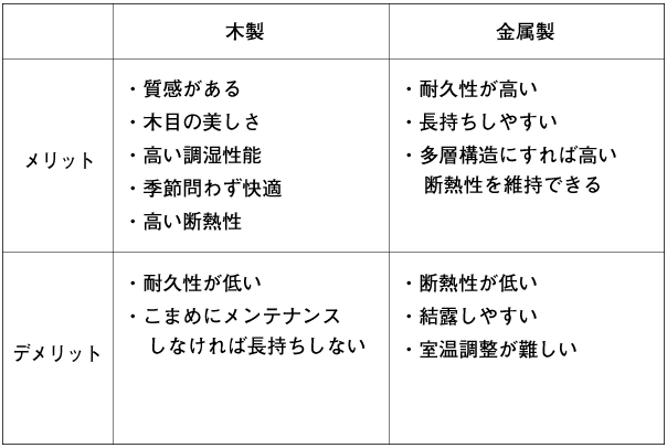 寿命も素材選びの大切なポイントですが、どんな建具が住居にマッチするかについてはトータルな視点が必要です。木製と金属製の違いを理解しておくと、バランスのとれた判断が可能になります。