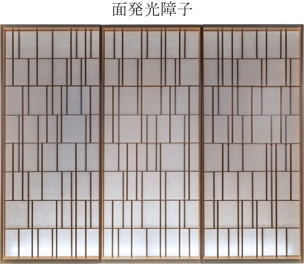 面発光障子は、両面に異なる格子デザインを施した上で、全面をLED照明で発光させる障子