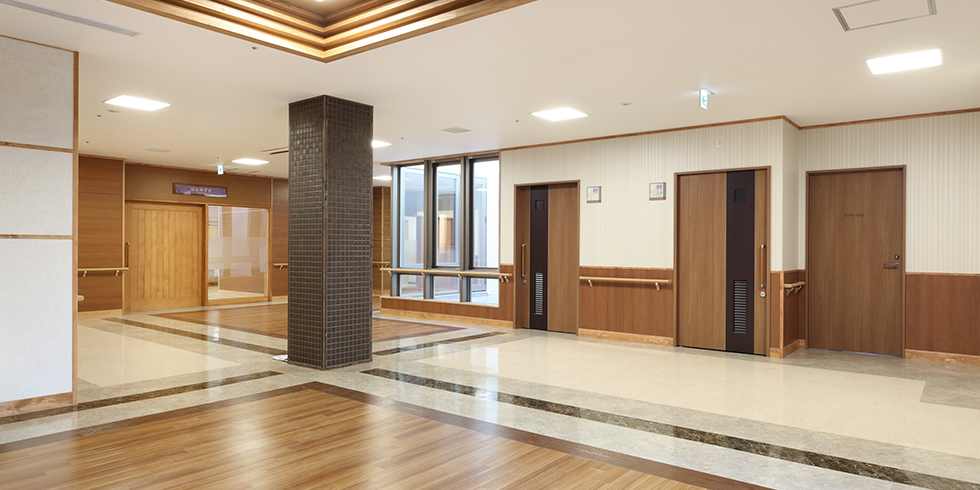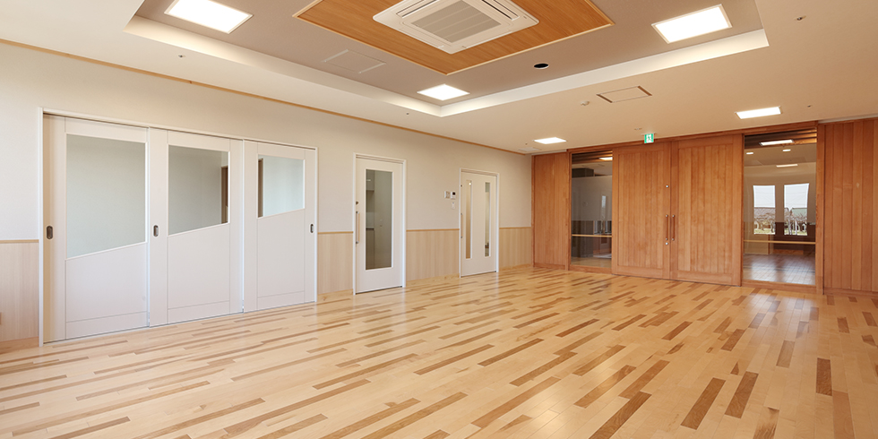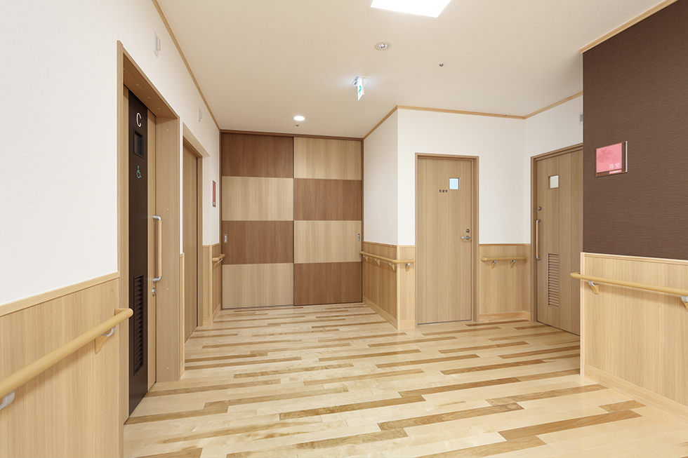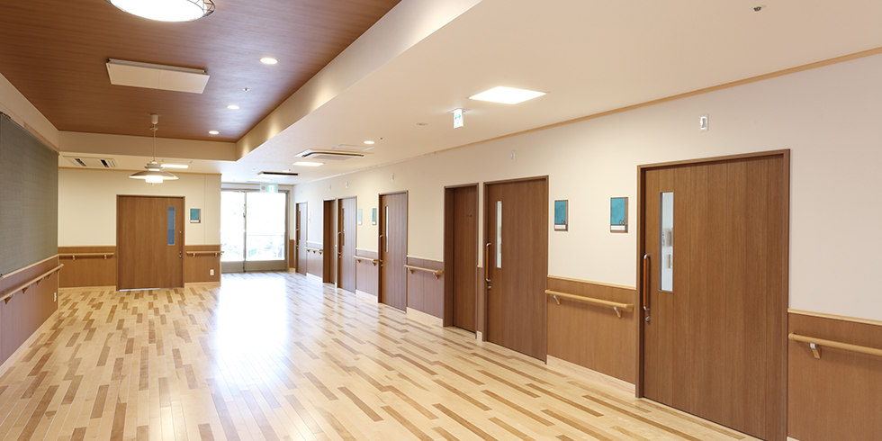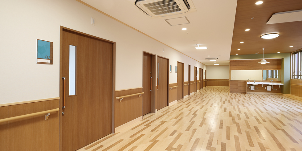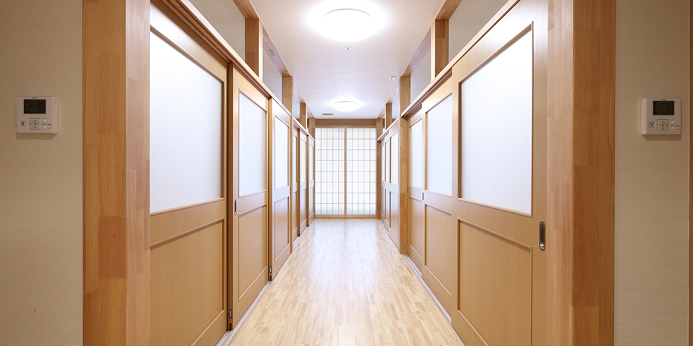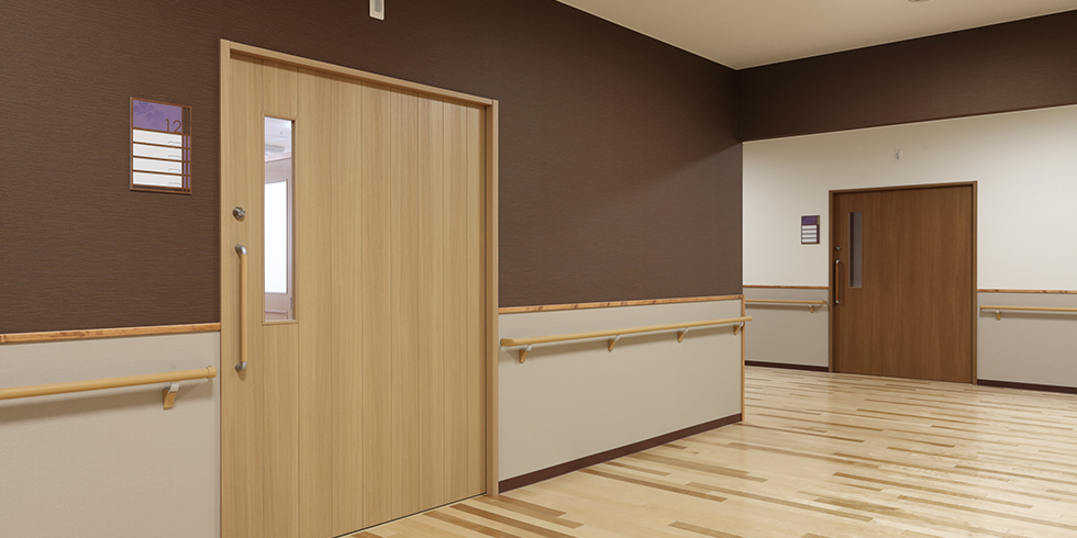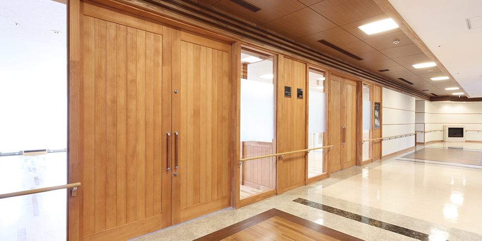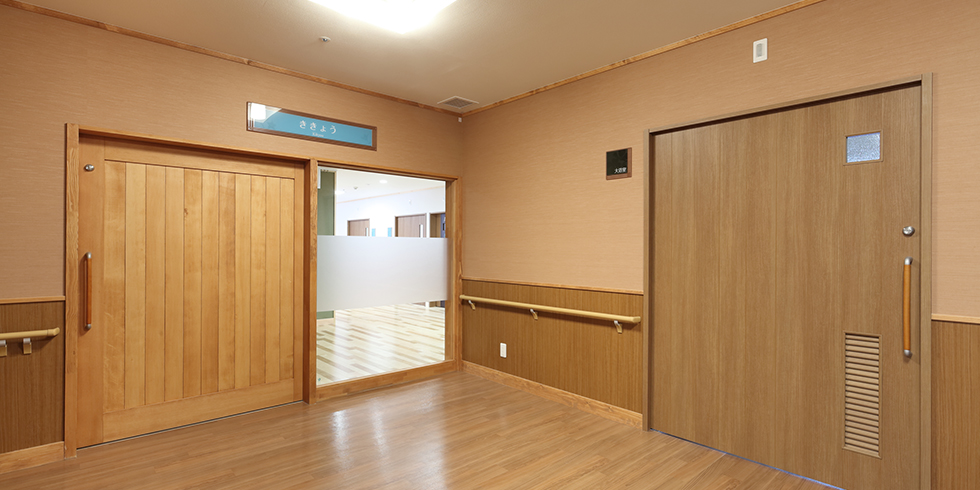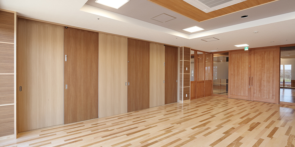 特別養護老人ホームひので新築工事 やすらぎが求められる老人施設のエントランスには米松材の縁甲貼りドアの採用で、無垢材が持つ自然素材のぬくもりと高級なイメージを演出しています。施設内の扉では一つの引き込み部に奥行きを設け、両側から扉が引き込めるダブルポケット仕様になっています。 納入商品 スライドドアハンガー(ハイブリッド枠)、オートスライドドア(ハイブリッド枠)、両開収納、収納折戸、片開、引違、障子 設計 株式会社 實徳設計 施工 岩崎工業 株式会社 ※当サイトの情報を転載、複製、改変等は禁止いたします。