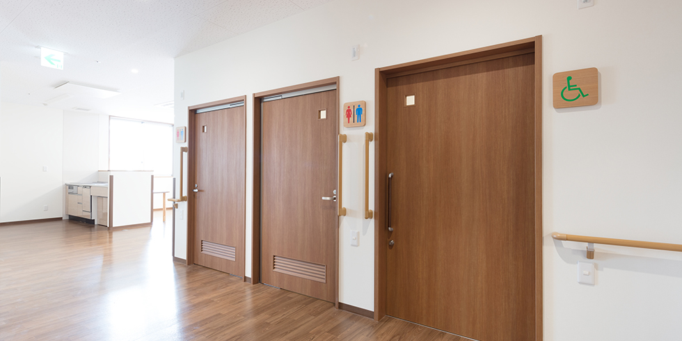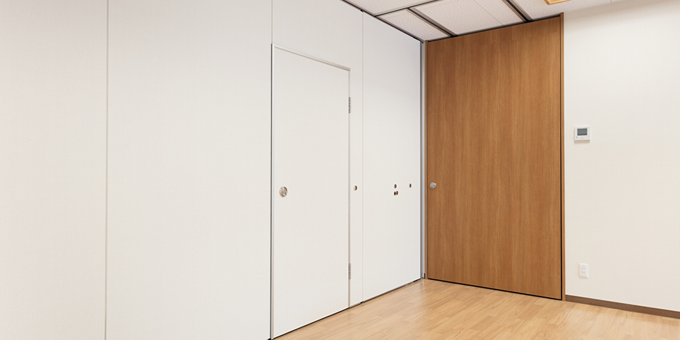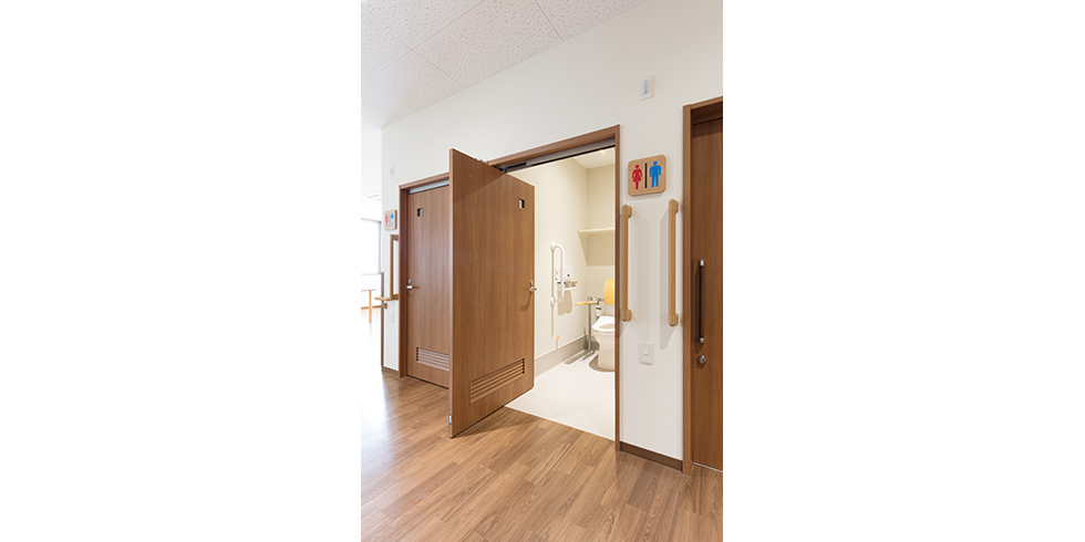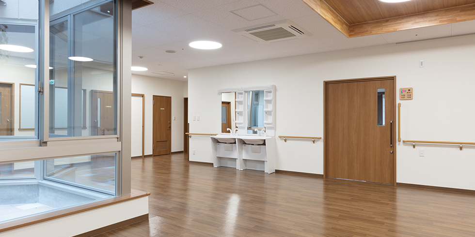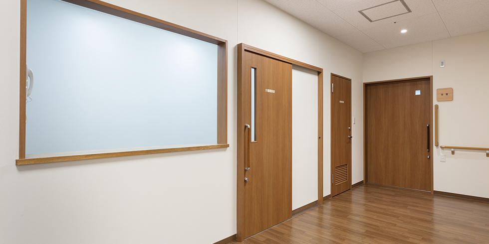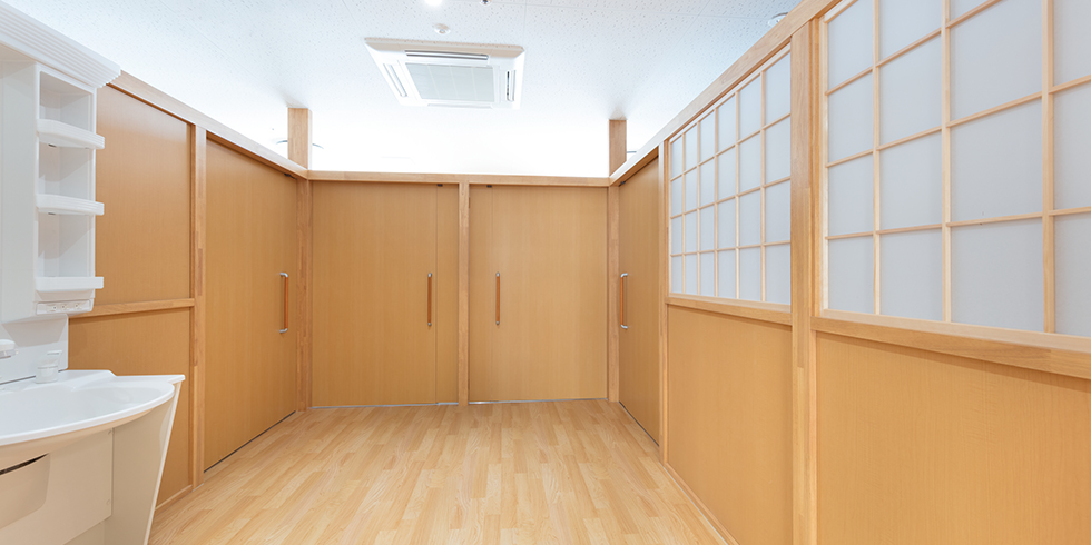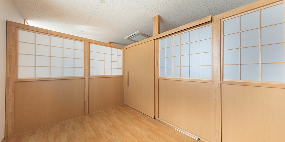 快適な生活と交流の両立を目指す介護施設。居室内にある木製パーテーションは、造作部と建具の工事を一貫してできる画期的な商品です。すべてユニット化された新工法で、確かな技術力から生み出された商品です。