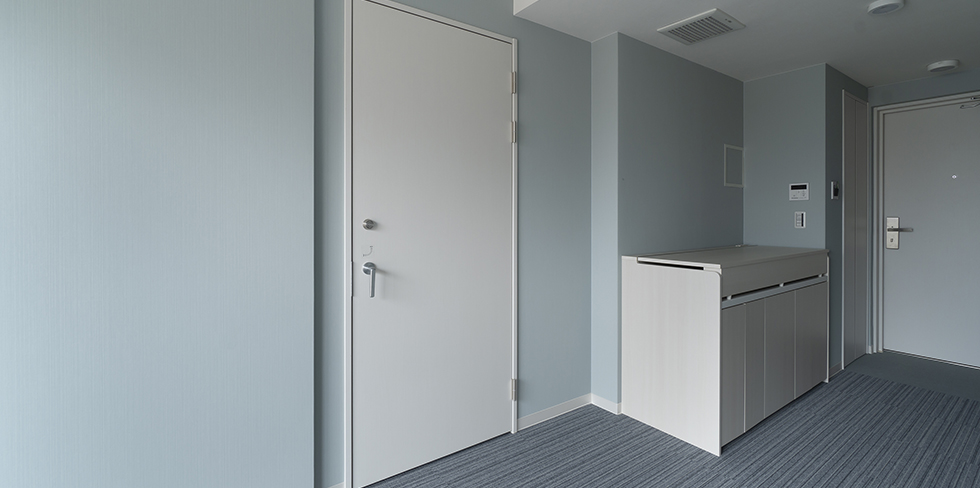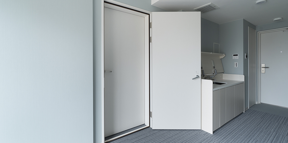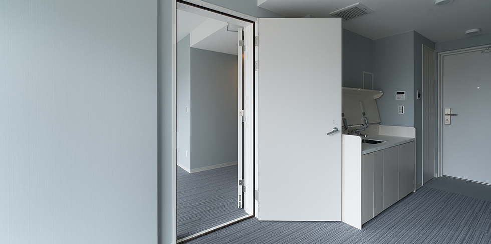1つの枠に2つの扉があるコネクティングドア。防火ドアと防音ドアを組み合わせることにより、隣合わせの部屋を繋げたコネクティングルームの欠点でもある音漏れを、内部構造が異なる2つのドアで共振を抑え防音性能を高めています。