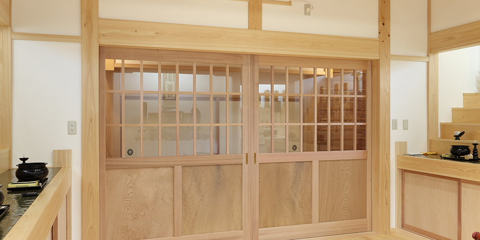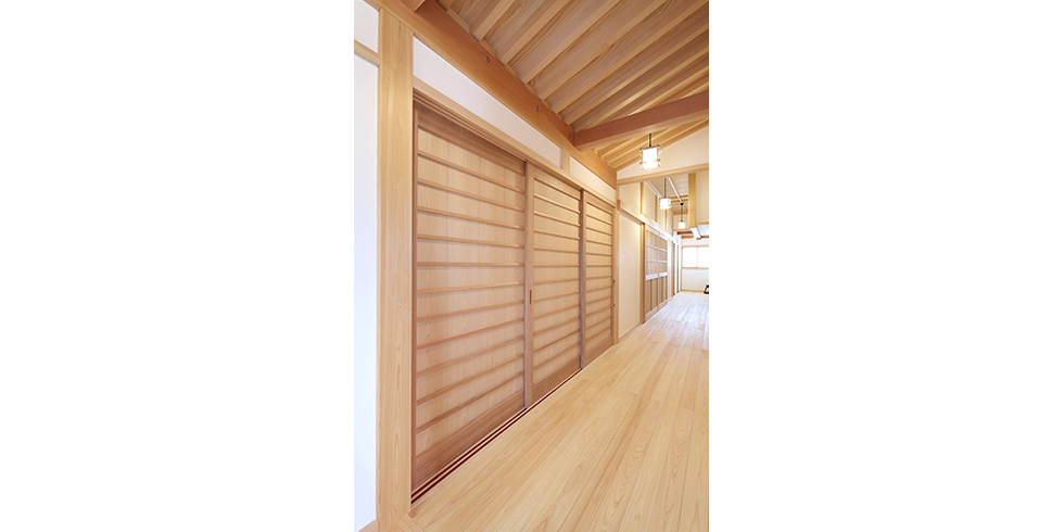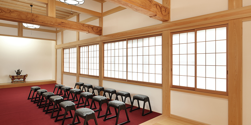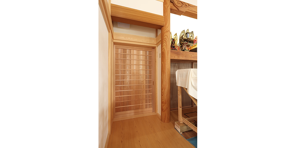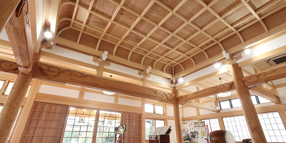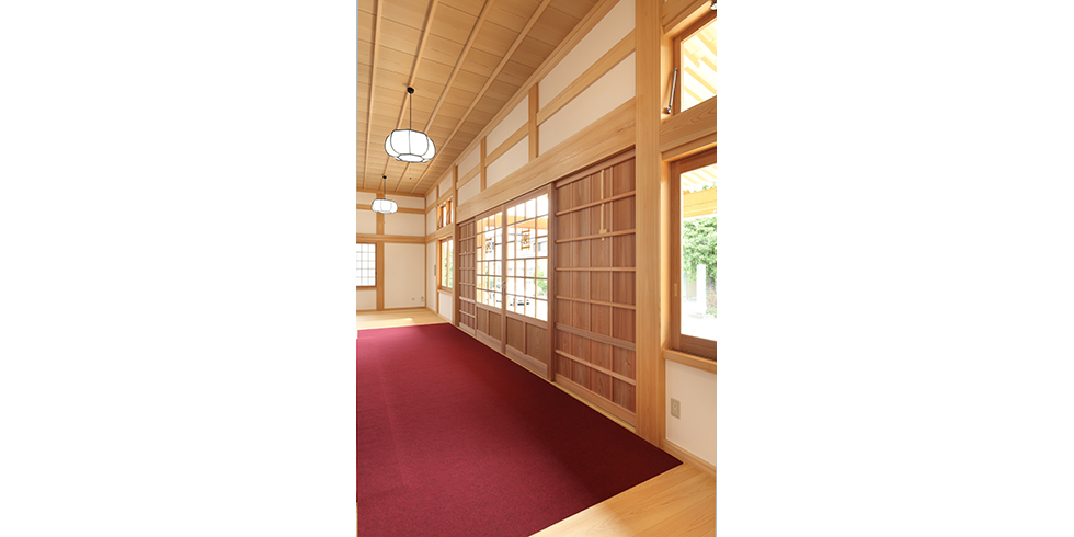 某寺 本堂 静岡県浜松市にある内陣の支輪格天井が特徴的な社寺。地杉赤材を使用した見込み違いの材を使用しており、重厚感のある仕上がりです。地産地消の考え方に基づき、地元産の材料提供を行い、舞良戸など日本古来の意匠との融合で荘厳な雰囲気を醸し出しています。 納入商品 腰付ガラス戸、1枚ガラス戸、舞良戸、障子、襖、板雨戸 設計 有限会社 玄建築設計室 施工 山喜建築 ※当サイトの情報を転載、複製、改変等は禁止いたします。