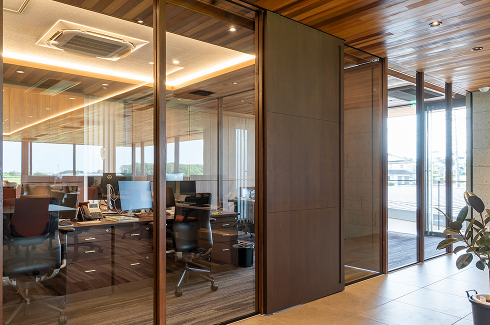 某新社屋 北関東エリアの企業様が創業100周年を機に新社屋を建設されました。阿部興業では、米杉ヨコエン コ貼りの木製玄関ドアやウォールナット材を使用した内装建具でお手伝いさせていただきました。 新社屋のイメージに合わせ特注製作されたものです。阿部興業では、本物を提供しお客様に感動を届けてまいります。 木製玄関ドア、内装建具 アーキテクツ一級建築士設計事務所 株式会社 斉藤組 ※当サイトの情報を転載、複製、改変等は禁止いたします。