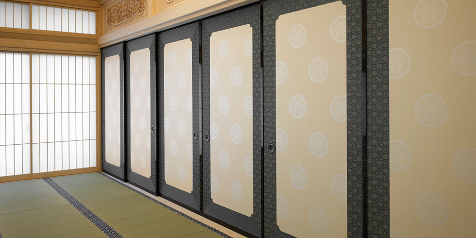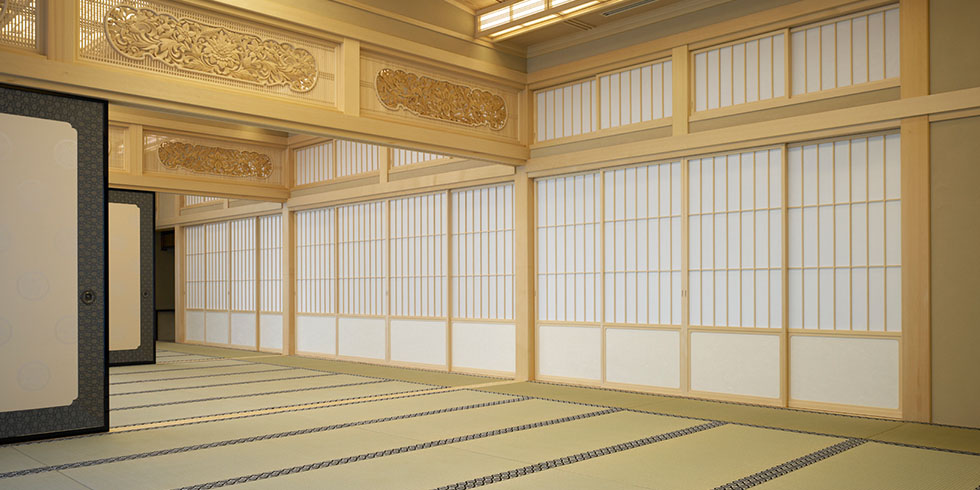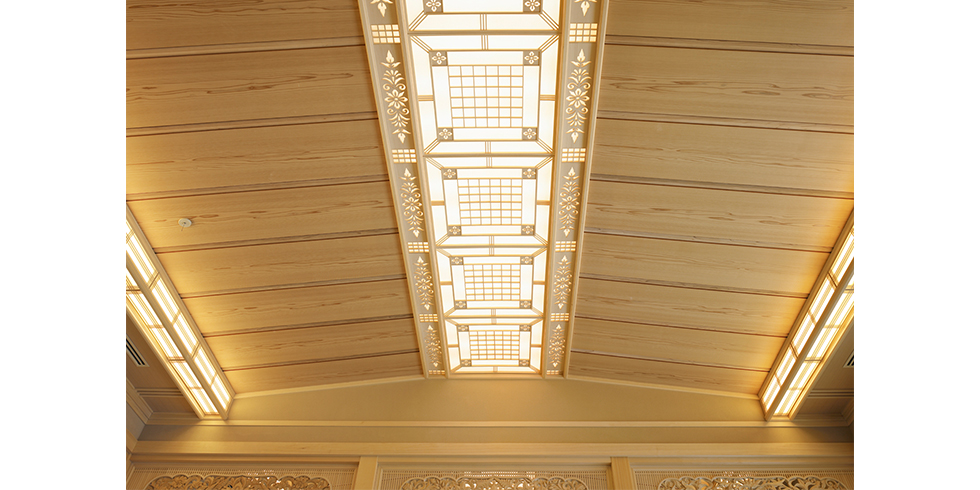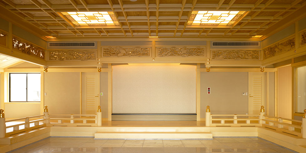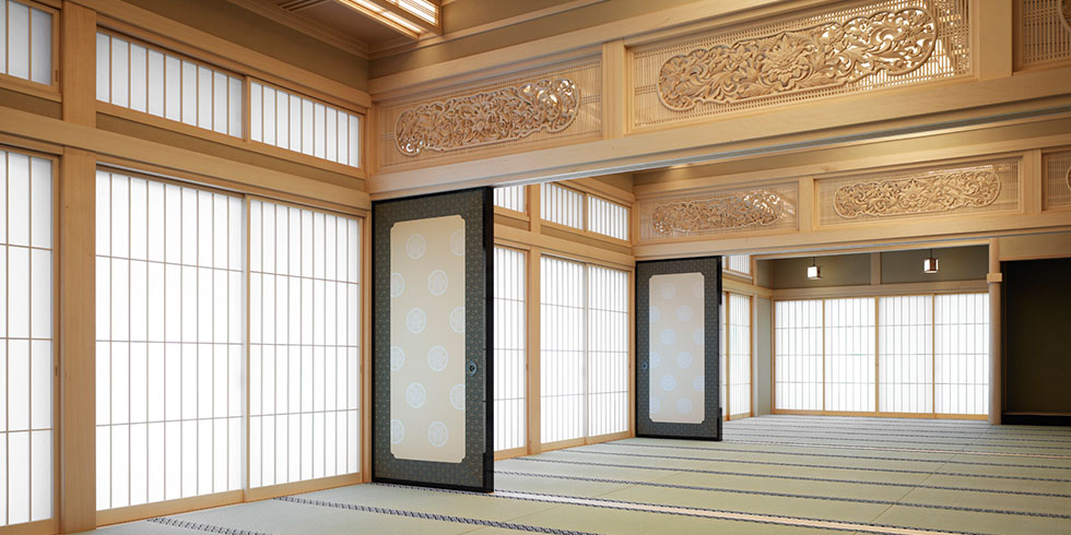 延命寺 組付け彫刻付書院風障子、 変わり源氏襖、彫刻欄間、腰付障子など、 伝統的な和建具をふんだんに採用し、 お寺に相応しい堂々とした設えになっております。 納入商品 組付け彫刻付書院風障子、変わり源氏襖、彫刻欄間、腰付障子など 設計 株式会社 中村昭雄社寺建築設計事務所 施工 松井建設 株式会社 ※当サイトの情報を転載、複製、改変等は禁止いたします。