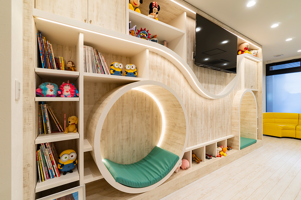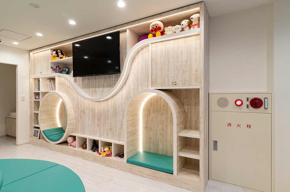 マリン小児矯正歯科クリニック 神奈川県茅ヶ崎市の小児歯科を専門とした歯科医院です。テーマパークのような雰囲気を持ち、子ど もたちが楽しく通院できるように工夫されています。阿部興業では造作家具でお手伝いさせていただ きました。ユニークなデザインの壁面収納は、絵本やキャラクターグッズがディスプレーされ待ち時 間も楽しめる空間になっております。 納入商品 造作家具 施工 株式会社村松建具店 ※当サイトの情報を転載、複製、改変等は禁止いたします。
