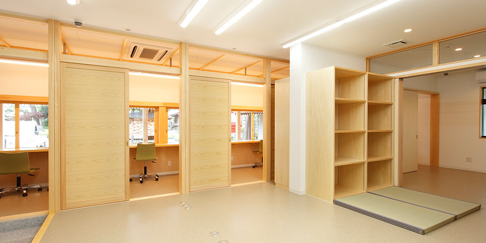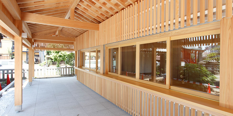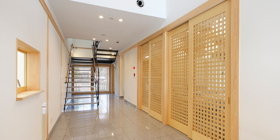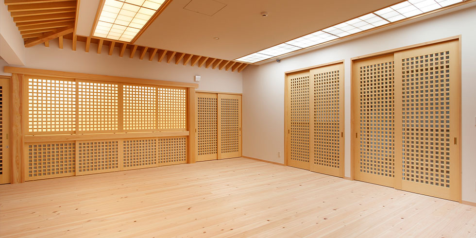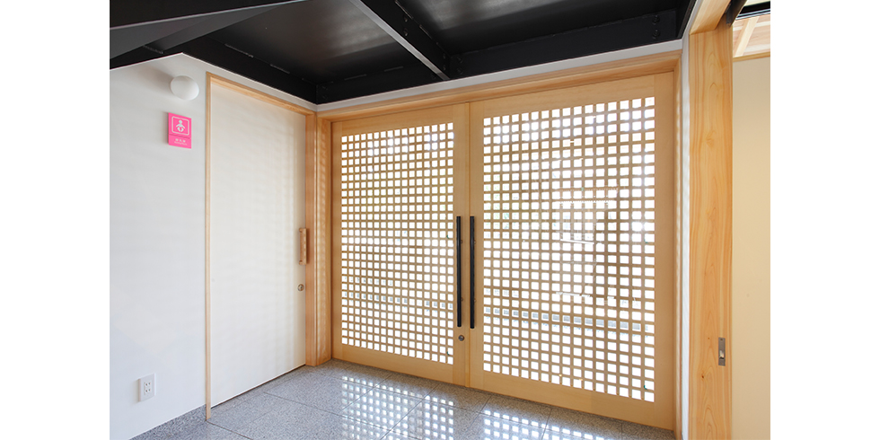 和樂備神社参集殿 神事を行う神社に似合う木製格子戸は、 荘厳な空間を演出するにふさわしい天然素材の間仕切です。 障子は両面に紙を貼る太鼓貼仕上げ。 ニーズを伺い、お客様のイメージに沿ったふさわしいアイテムを ご提案・ご提供いたします。 納入商品 米ヒバ格子戸・杉板戸・スプルス太鼓貼障子・洗面台・下足入・書類棚・御札所収納棚など 設計 ワイズデザイン一級建築士事務所 施工 松井建設 株式会社 ※当サイトの情報を転載、複製、改変等は禁止いたします。