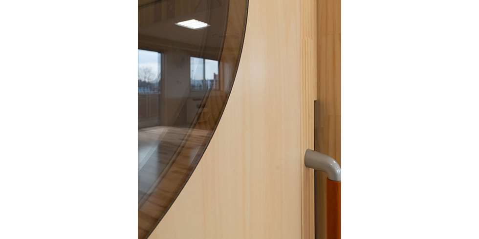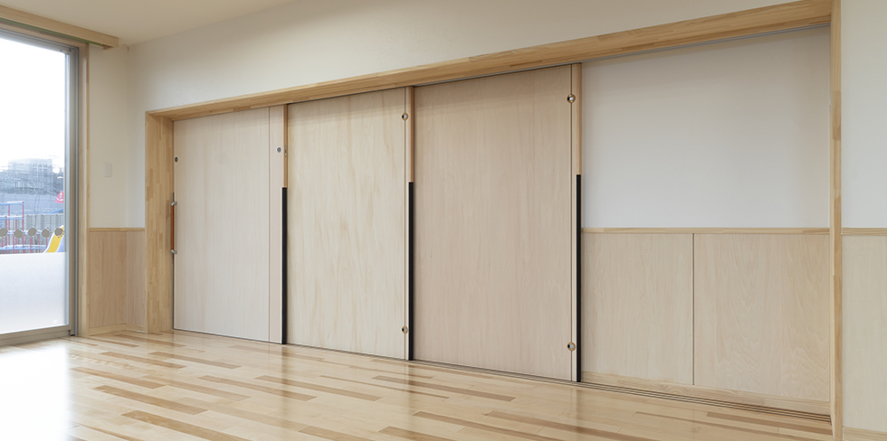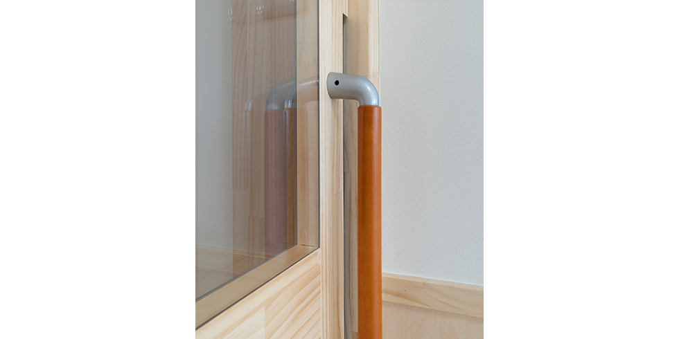 扉表面と窓が面一になっている額のないデザインは、扉を引き込んだ際に枠との間で指をはさんでしまう事故の防止になっています。