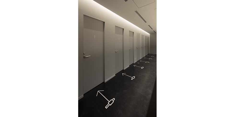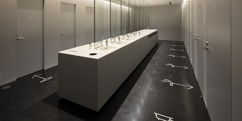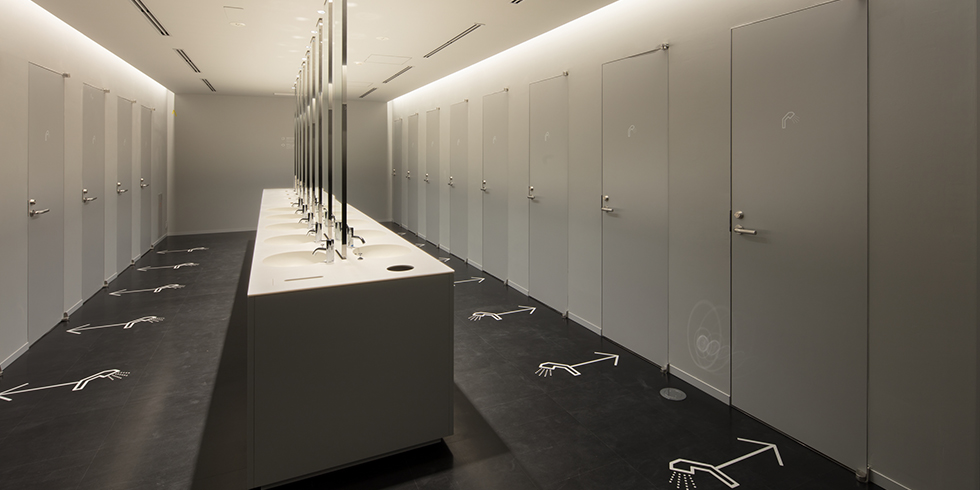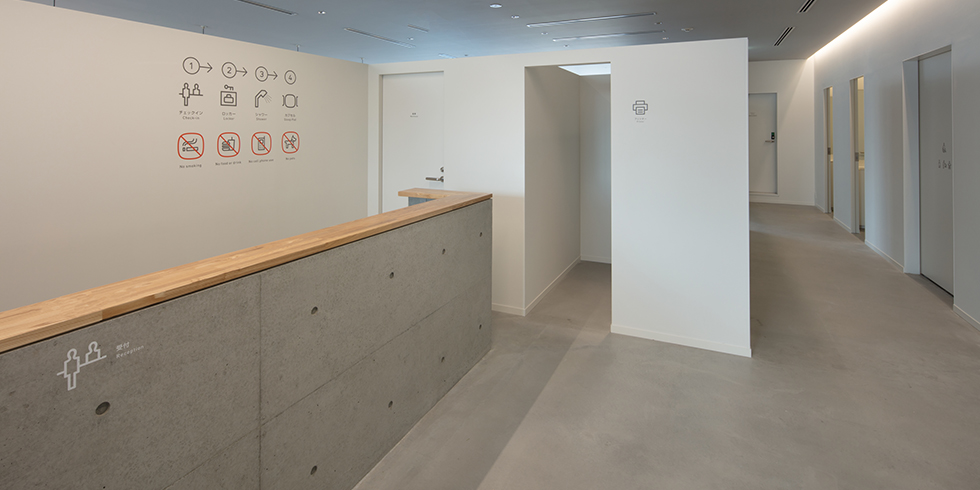 カプセルホテル ナインアワーズ(9h nine hours) の都内1 号店。余計な機能を排し、機能性と合理性を追求した設計・デザインで高い品質を維持しています。機能性を随所に表現したサインもユニークなコンセプトを裏付けています。