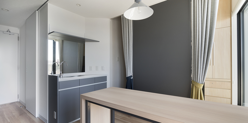 • 納入商品 フラッシュドア(オレフィンシート)、造作枠、造作家具(キッチン収納、吊戸棚、片開収納、ハイカウンター)