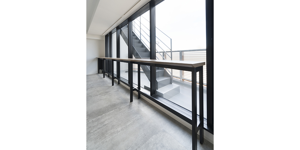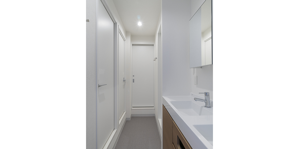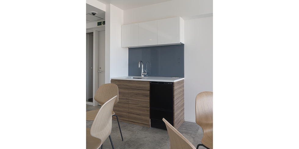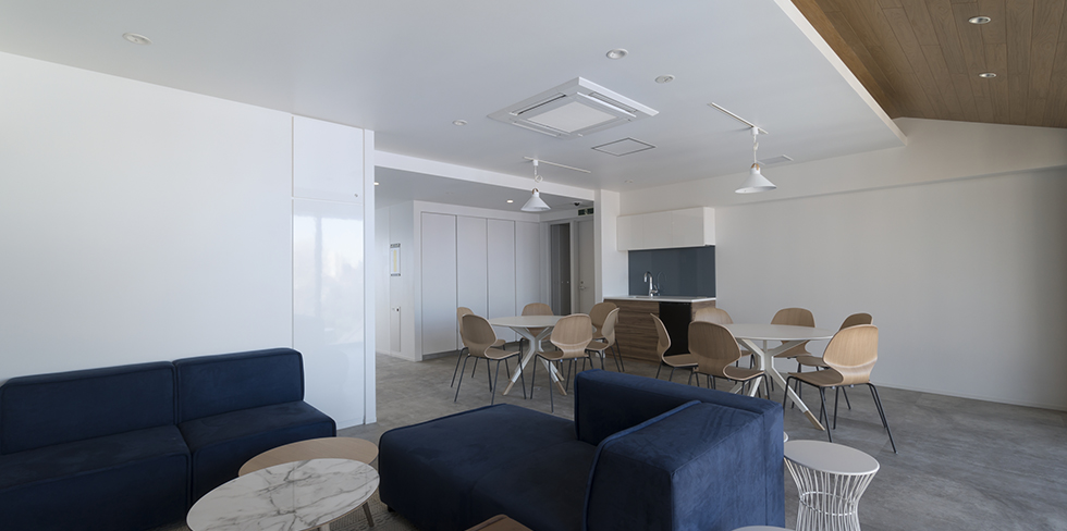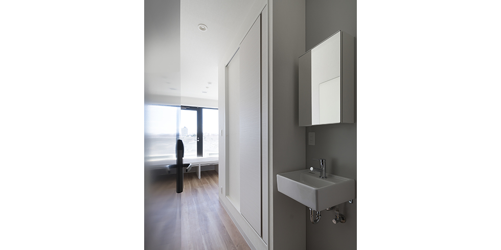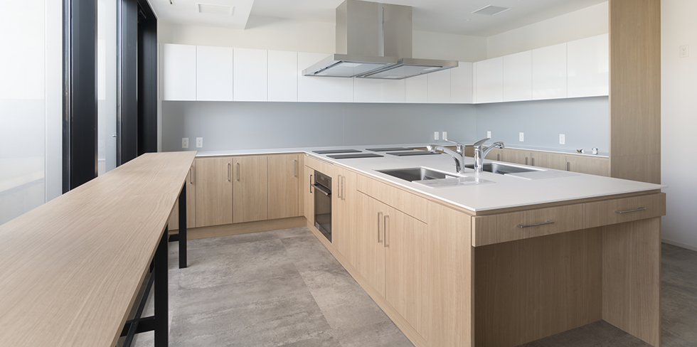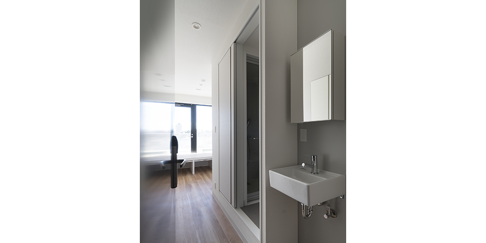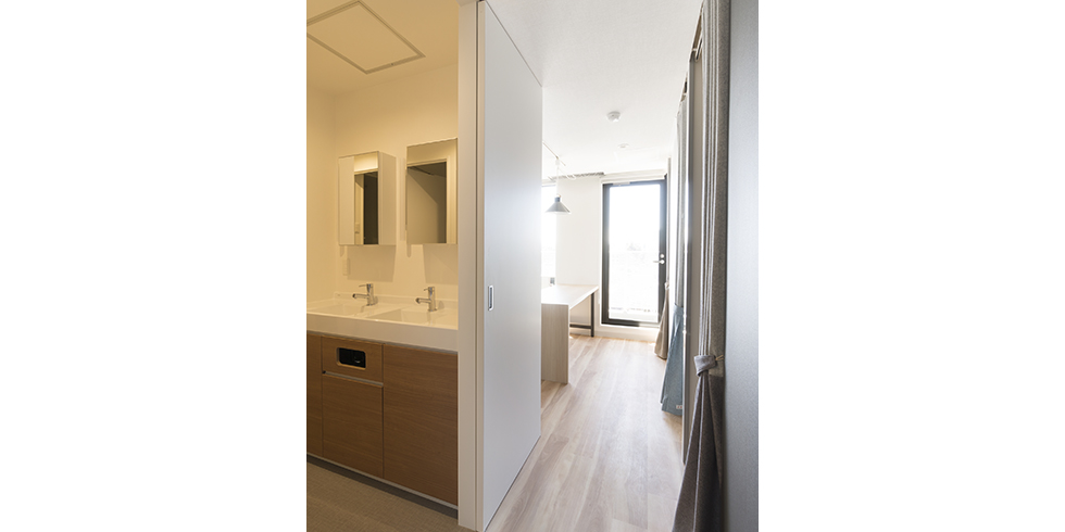 海外からの留学生と日本人学生が一緒に居住し混在する学生寮は、プライバシーとともにコミュニティ形成に配慮。プライベートとパブリックがほどよく混ざり合う共有スペースの造作家具が、そんな空間を創り出しています。