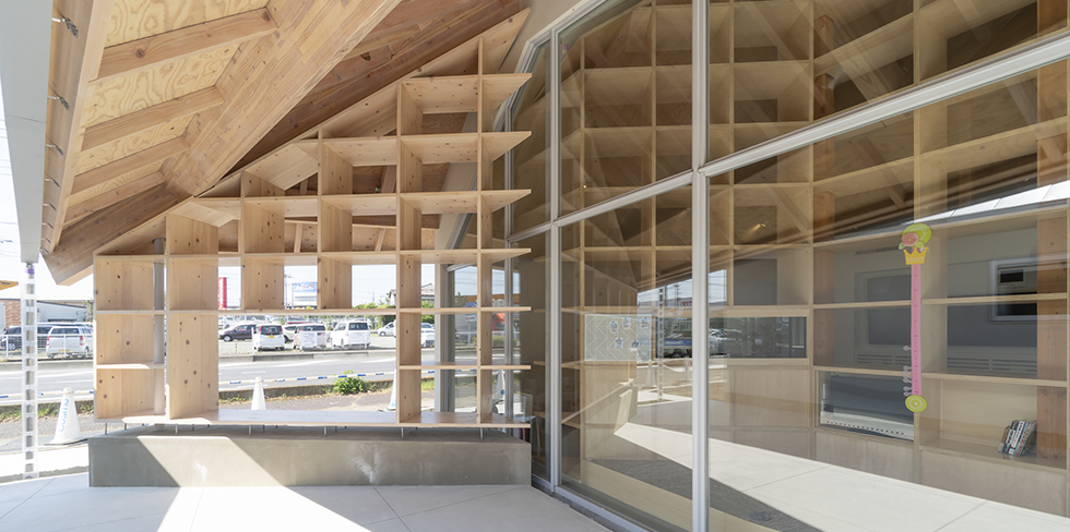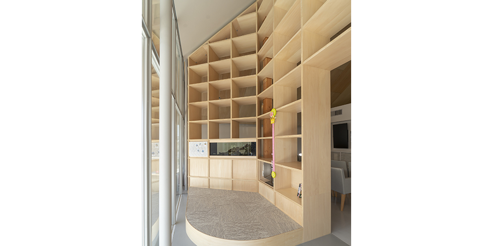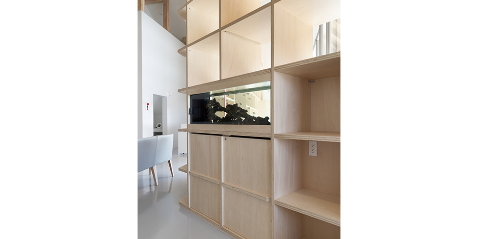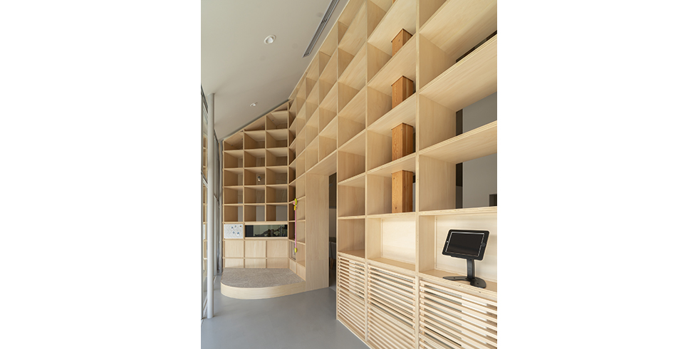 やわらかな色合いが特徴のシナ合板を使用した天井にまで達する巨大な本棚が印象的なクリニックは、病院独特の冷たさや怖いイメージのない空間にしたいという院長の意志が反映されています。空間を仕切りながら収納としても使用できる本棚の一部はアクアリウムになっており、順番待ちの患者さんを和ませる空間となりました。