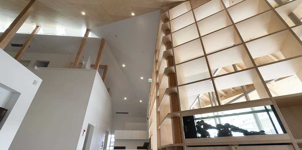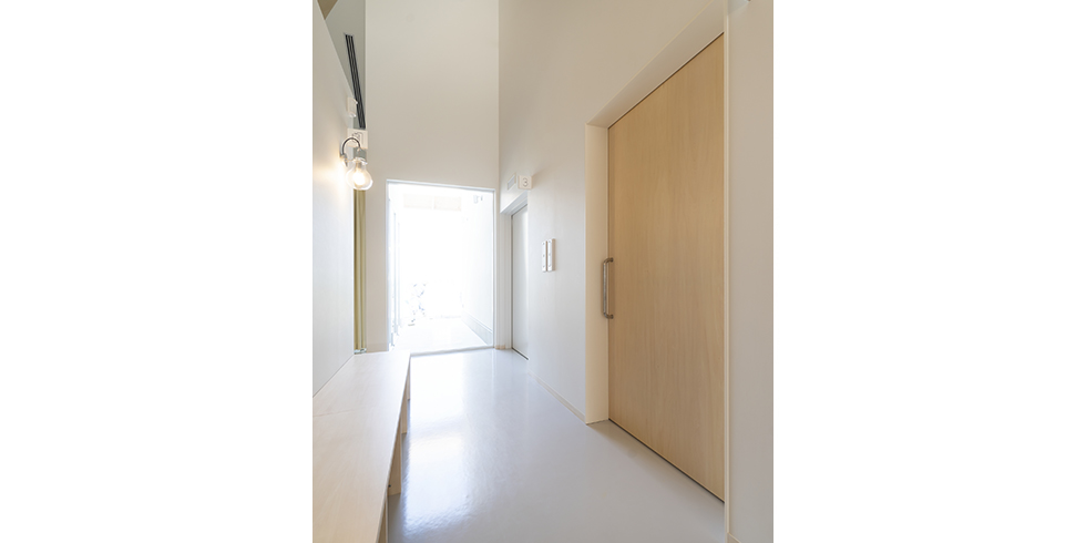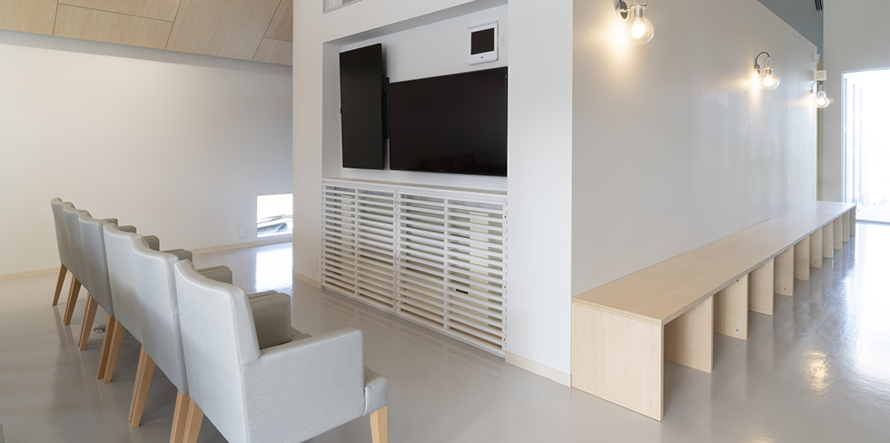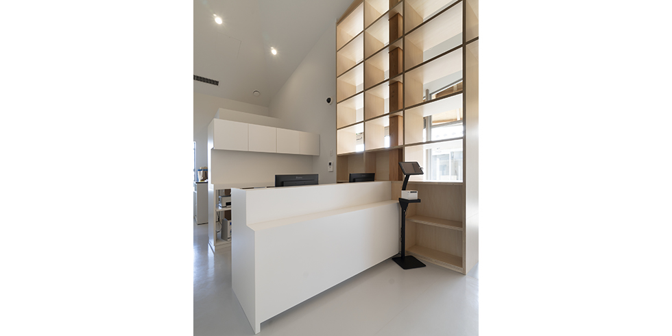 • 納入商品 内装ドア(シナ合板・ECOシートP色・AK-B151白単色)、造作家具(壁面収納・木製ベンチ・検査台・受付カウンター)、階段
