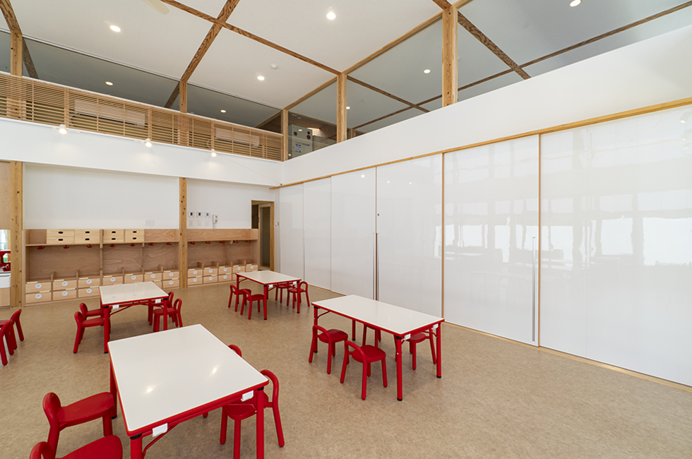 園舎内は美しい木目を基調とし、外廊下には一面ウッドデッキが設置されており、まるでおしゃれなCafeを連想させる空間が広がります。