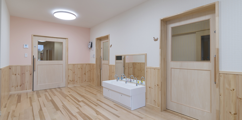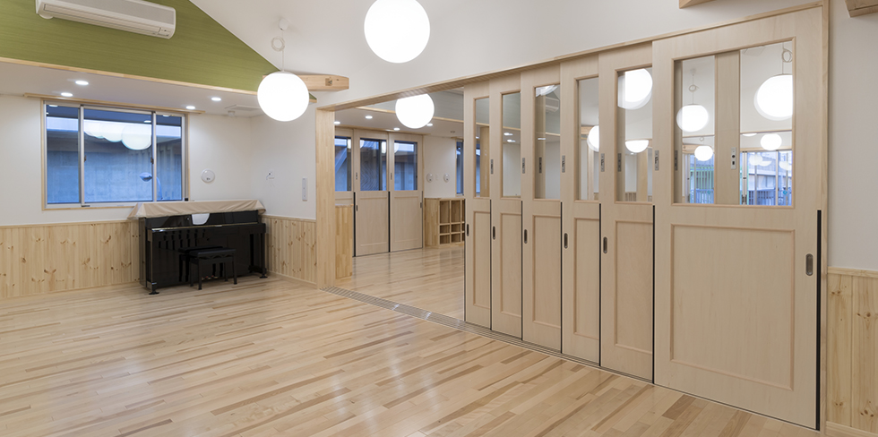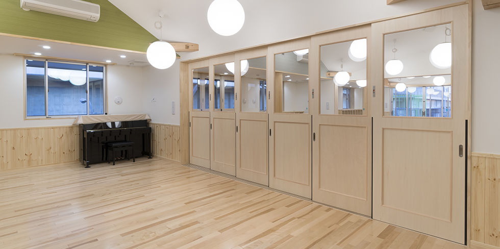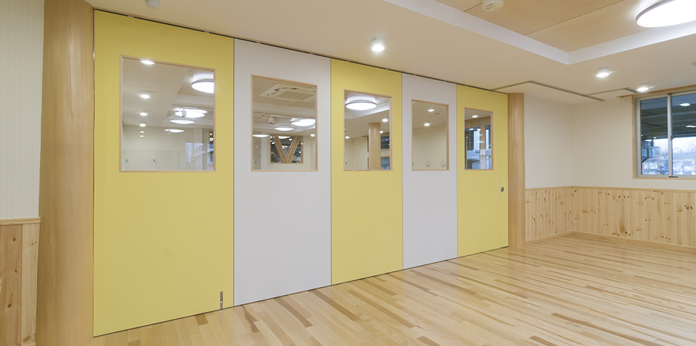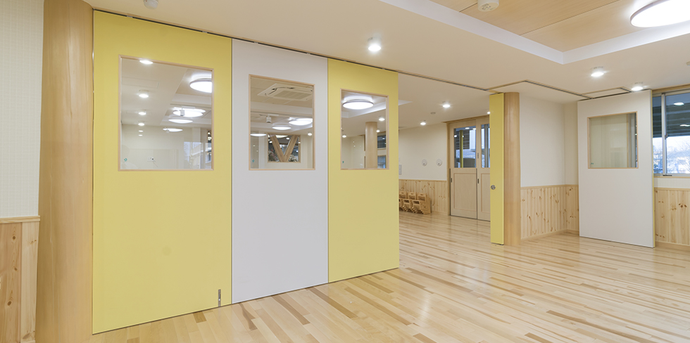 こだま虹保育園 あたたかい昼間のおうちを目指した保育園では、家庭的な雰囲気を大切にしています。そんな保育園の間仕切りに、お遊戯会などの催しで、簡単な軽い操作で開放的な空間をつくり出すことができる「AKライト・スライディングウォール」が採用されています。 納入商品 内装ドア(パイン集成材・シナ合板)、AK ライトスライディングウォール(クロス貼)、造作部材、造作家具 施主 社会福祉法人 日の出福祉会 兵庫県多古川市 設計 株式会社 フリドアーキテクツ 施工 岩崎工業 株式会社 ※当サイトの情報を転載、複製、改変等は禁止いたします。