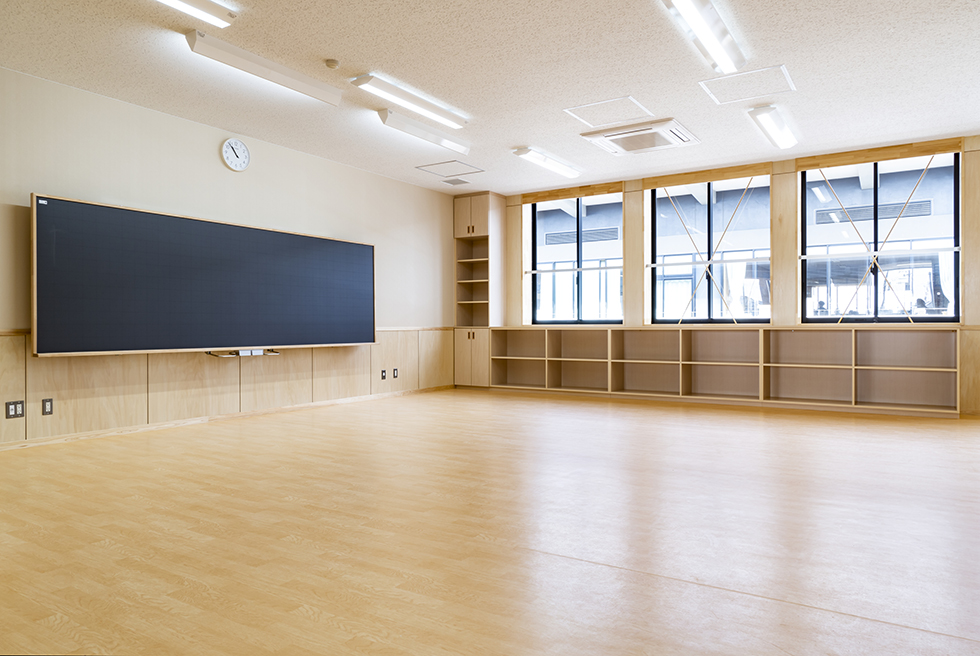 園を一周する土間回廊の下足入れ。光をふんだんにとりいれた明るい園内に自由に出入りでき、生き生きと過ごせる環境を整えています。
