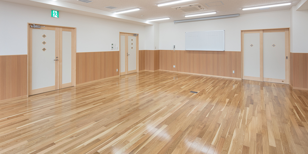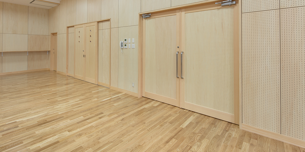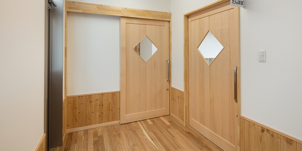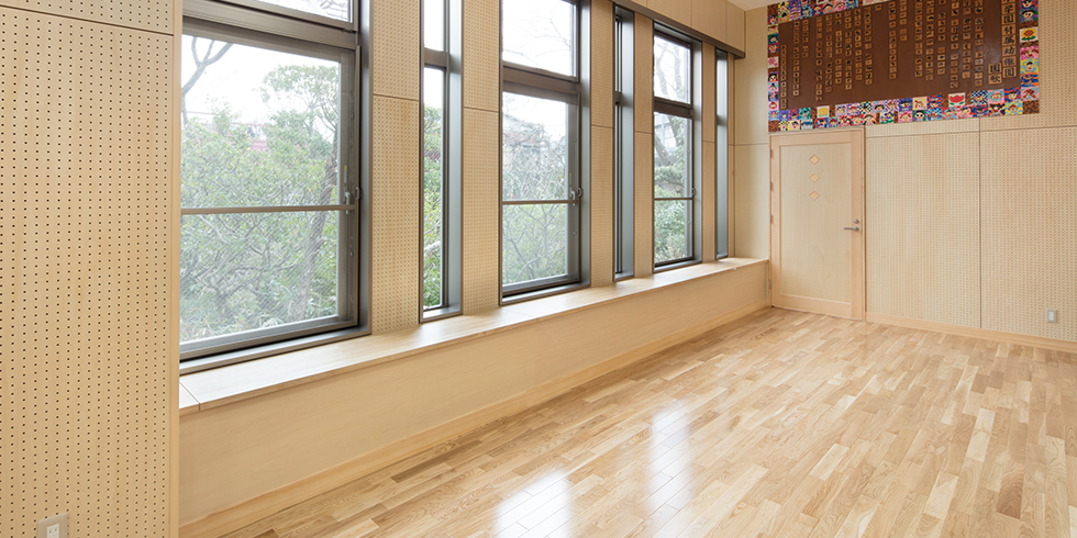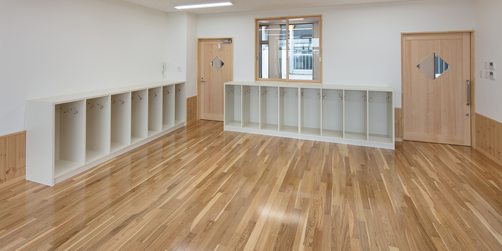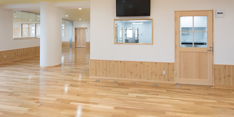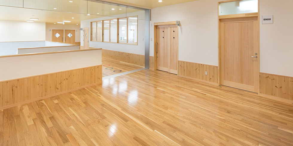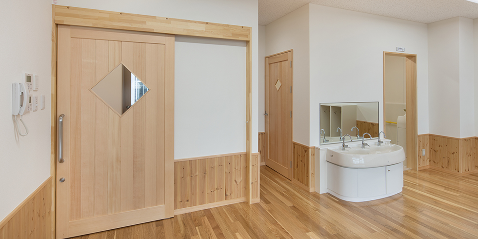 「健康で明るく元気にあそぶ子供」を育てることを目指す幼稚園の特徴は、情緒の育成、体育能力の育成、健康管理。この特徴に見合った施設内には、やわらかい質感とやさしい印象のパイン材の扉がマッチしています。
