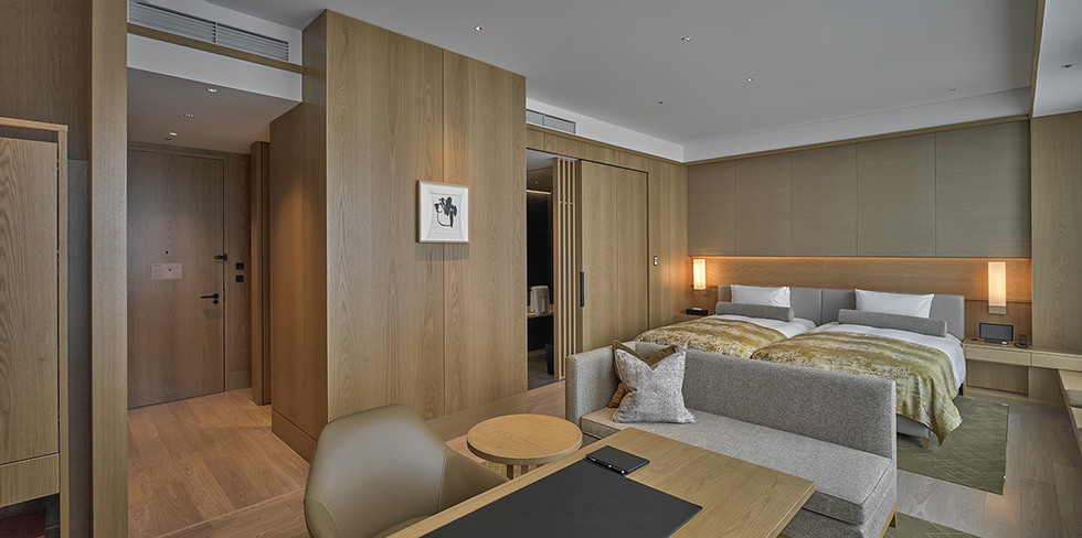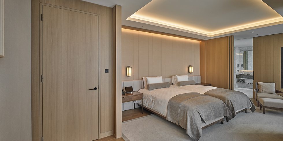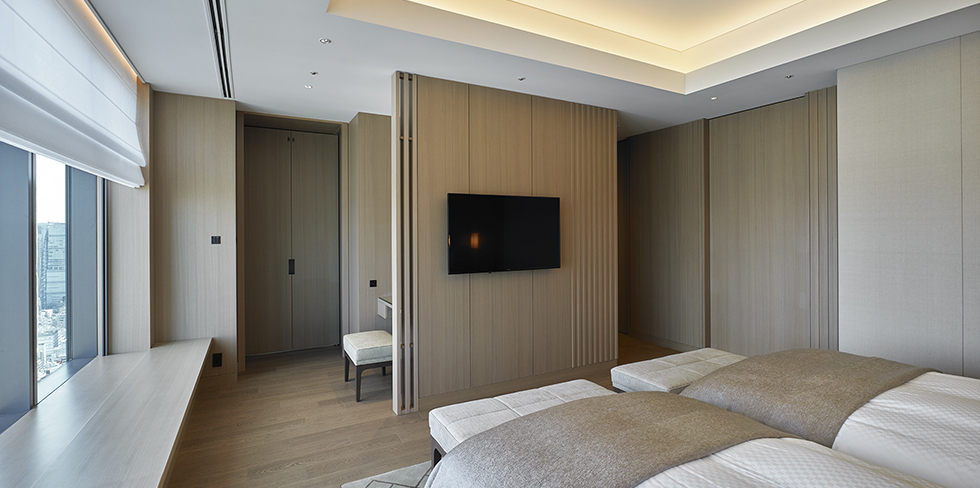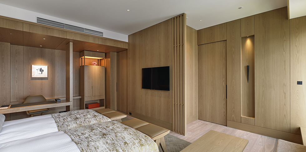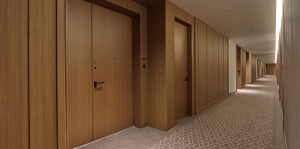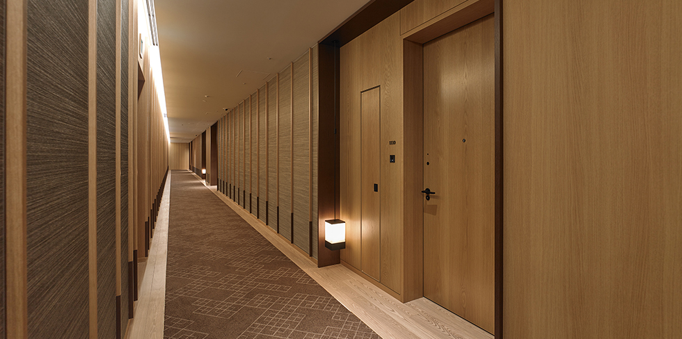 客室の扉・枠・壁面を同一素材かつ面一仕上げにすることにより壁面と同化し、客室什器にそっと寄り添う、シンプルさと洗練された佇まいを実現しました。