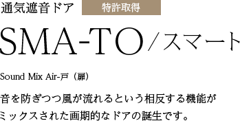 特許取得「通気遮音ドア SMA-TO/スマート」Sound Mix Air-戸(扉) 音を防ぎつつ風が流れるという相反する機能が ミックスされた画期的なドアの誕生です。
