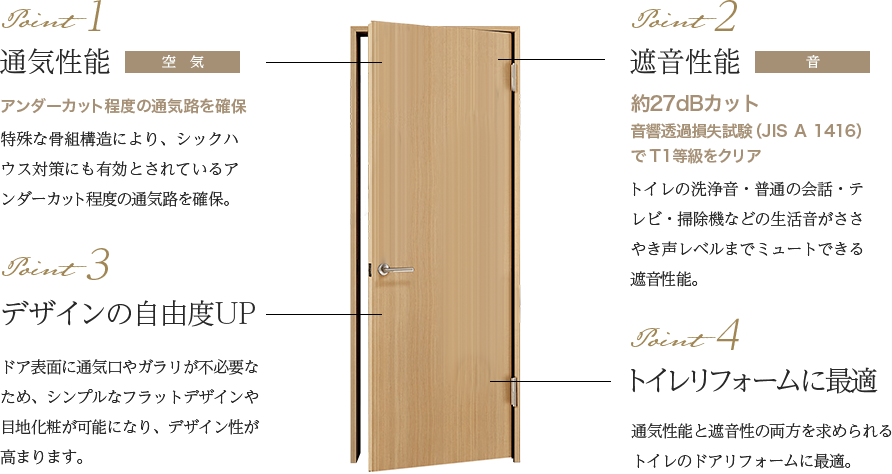 1.通気性能 2.遮音性能 3.デザインの自由度UP 4.トイレリフォームに最適